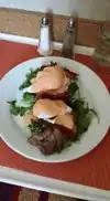 I had a Cobb salad with salmon and my daughter had a salmon sandwich, both were awesome. The grilled salmon was better than what I do at home on the grill, which I think is pretty good and better than most restaurants. My wife enjoyed her salad with apples in it but the chicken breast was a little dry. The waiter was prompt but we were in a hurry and the food took a very long time to be delivered.