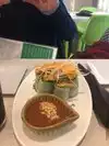 I knew this would be a Thai restaurant and was not expecting to have sushi. But they offered $1 sushi on a Tuesday night, and I made that part of my meal. The sushi was excellent, although the pieces seemed a little smaller than average (hey, still a bargain at $1). It's a small place and tables are jammed pretty closely to each other; the people at the next table were nice. The staff is very friendly. I tried the green tea I've cream cake that I've heard Dallas residents rave about. It was good, and certainly different, although it's not something I would order every time.