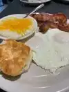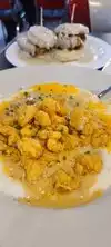 Southern breakfast with buttery biscuits and fried chicken. It’s a once in awhile place to eat. Minus one star for serving hot coffee with a plastic straw (microplastic leaching into the coffee?!?)
