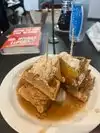 I had shrimp and grits with fried shrimp. I was charged $2 extra for the shrimp. I was offered fried or grilled, but not told there was a charge, so not sure if I choose grilled whether there would be a charge. (Which would make NO sense because without shrimp there is no shrimp and grits). The flavor was excellent. Hubby had peach French toast which he really liked. What I DID NOT like was that I couldn't get any drink other than coffee or tea that wasn't in a single-use plastic bottle (including water). Not cool. If you have the capacity to wash dishes and mugs, you can wash a cup and help us save the planet.