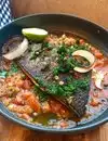 I love the food, seating and service. Parking is terrible because it’s located in downtown Austin. They typically have valet parking but have gotten rid of that service since COVID. Masks are required to get in and walk around at least in June 2020. They also cut their menu in half and changed the offerings. Pre COVID my favorite dish was the sea bass served whole on a banana leaf. They don’t have it on the menu anymore. I ordered the mahi-mahi with a cilantro sauce on lemon wrapped in banana leaf. It was served with a tomato sauce with green olives and basil rice. The fish was moist and tasty. Combined well with sauce. We also got the octopus and shrimp, guacamole and green salsa tapas. I could have had the octopus dish as my dinner. It was my favorite dish tonight. Everything is gluten free. Their chips were outstanding! Great place for large groups, date night or business dinner. I highly recommend this place. You can’t go wrong with anything you order.