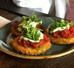 Check it out for happy hour when you can feast of tasty portions while you sip your cocktail. Great seating outside with the wall of succulents. The staff is genuinely friendly. You'll want to return to keep sampling the menu of enticing choices.