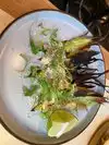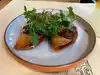 Excellent industrial vibe, we had an early dinner so quiet and service was excellent (thanks Evelyn). Unfortunately wines include natural ones and we tasted a small sample of the two reds, albarino and sparkling and none appealed. So we ordered the Kolsch beer which matched the courses well. Even though we are carnivores we love cauliflower and brussel sprouts, so had them, the roasted cauli with coriander pesto, brussel sprouts with blistered peppers along with a persimmon salad and squash blossoms. All the courses were sublime with good presentation with just the right amount of heat/spice. The enamel plates were appropriate. Can thoroughly recommend.