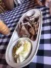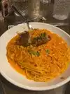 Top quality of pork shank and garganelli pasta! As appetizer, the arancini are a tradicional fare but presented in a fun egg ceramic dish. While waiting for your order, try to identify the famous people on the big posters. Service is cordial, not in a hurry for you to eat and pay.