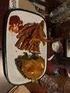 Awesome black bean and Veggie burger (the sunshine) for vegetarians! The best black bean burger I have ever had. But the meat eaters were impressed with beef and bison sliders. It was rounded out w pinion rings and fries.