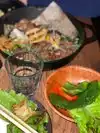 Thursday night packed, but we had a reservation for a birthday celebration. It ended up being a great meet-up place for all parties in our group, not too hard to find, even in the rain at 7:00 pm. Kudos to the staff attending to the BD member with complimentary appetizers, drink and dessert. The "bowls" were popular with our group and though some may say on the small-size, they were spot on for us. One member got a seafood stew served in a large cauldron-type bowl with a flame under it keeping it boiling hot! Upstairs seating awesome. Added benefit, pay cash and get a 10 percent discount...ATM is downstairs near the restrooms.