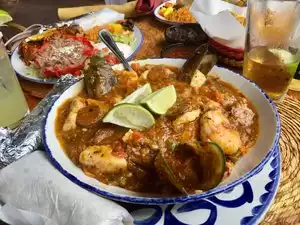 The shrimp fajitas are my recommendation! Beautiful garlic flavor with a plate full of beans, rice, guacamole and sour cream. Cold beverages from Aquas Frensca, Soda and of course the favorite of many the margarita. Continuous chips, salsa and beans made fresh and handmade tortillas by a cute little lady behind a glass surround barría. Enjoy!