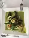 Basil is not far from the hotel we stayed at in San Francisco. We talked about going for most of our week long visit and finally go there on the second to last night. We were so glad that we did. The menu was extensive. My wife had something with duck and I had lamb, and we split an appetizer. I don't remember the names of the dishes. After dinner we had coffee and dessert. The food was all delicious and the service was very good. The only very slightly negative comment is that it was very loud inside, but the decor was really lovely.