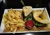 Quick services great food friendly staff ! A great bite around the corner from the hotel ! We loved the wings and the shrimp the most Beer was frosty which is a must family friendly as well a plus plus !
