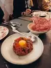 This is not the place for the gustatorily faint of heart. It is a great destination for the food adventurer who loves beef and all the richness it can convey. You will not leave hungry! The menu revolves around beef in all its many manifestations. Start with the Reuben mille feuille ( first photo) and the awesome French onion croquettes (third photo). Relish the gorgeous hamburger that is not on the menu but is a house specialty. Dive into the unbelievable selection if locally sourced beef and let the chef choose which sauce goes best with each cut (middle photo). As the night goes on, watch the staff cross various cuts off the menu -- they have a finite number of each on the day. Finally, revel in the sides. They probably have dessert, but none of us made it that far! The service was truly outstanding. The wait staff know their beef, their wine, and their everything else. Trust them! You may wonder why this isn't a five. That is only because fresh veggies and salads were missing, reportedly because the right things were not locally source-able today.