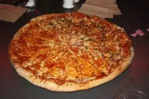 Pizza average. Biggest call for patrons is huge size pizza not quality of pizza. Ordering with group before being able to take a seat is a nightmare. Several large groups left while we were in line because of that.