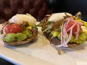 A we some place with great food and ambiance. Great store and other amenities. Loved the bike parking lot. The food was excellent. We had huevos ranches and fried chicken sandwiches as well as chicken and waffles and the Cobb salad. The deviled egg appetizer was a good surprise.