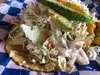 We shared the "Grilled shrimp tacos" and the "Fish & shrimp v'cruz" plates. Very casual dining room, order at the counter and pick-up at the counter. It was very busy but never crowded as families came and went without lingering. It would be a great place to stop after spending a day at Sea World, a couple of blocks away. Both grilled plates were very good but the Vera-cruz plate had better seasoning. They also have a take-out window for those who prefer to drive thru.