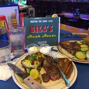 Stayed in a hotel down the road before driving cross country, and asked the desk person for a suggestion for dinner. Bill's was it, and I drove over and found the local place to be pleasing in every way. A simple unassuming place, a bar on one side, dinner tables on the other, it was comfortable from the moment I entered the door. The two waitresses were friendly and attentive, giving good suggestions (the kickin' chicken soup was spicy hot and tasty!). Had the filet wrapped in bacon and it was superb. Any Outback (outhouse I call em) i've eaten in didn't come close to the quality and price of Bill's Steakhouse. I was there for an early dinner, looks like it gets going socially after dark, but for food, alot of locals were eating at the early dinner hour, good sign! this is a fine choice that lends some local color to a first trip to Portland.
