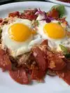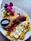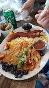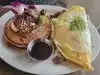 While Waiting for a store to open next door was hungry for breakfast, saw this place and went to their website while walking toward the restaurant. Saw omelets starting at $20 and immediately turned around to tell my friend how ludicrous they were and leave but stopped when I saw food being brought out. Plates were piled high with amazing looking food. we had a huevos Ranchero dish wth chopped of beef churasco, sofrito nd chorizo sausage over two whole english muffins with over easy eggs and guava sauce. My friend had a huge avacodo with big grilled shrimps, cotija cheese and a guava swirl. Well worth it, do not need to eat the rest of the day.