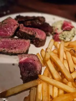 Nice authentic old French bistro atmosphere. Staff very friendly. Snails were excellent. Onion soup was a bit sweet. No pepper grinder available? Asked for medium steak got medium rare, slightly tough steak. No proper sauces available.. No mushroom or simple pepper sauce, which was weird. We were given aiolie and ketchup... Haha. Creme brulee was good. No espresso available and the brewed coffee was not good. No Wi-Fi to order an Uber. Enjoyable lunch but do not expect too much
