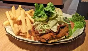 I ordered the spicy chicken sandwich for 23.00 and it had no sauce or seasoning, and though crispy was dry, in fact McDonald’s has a better sandwich for 5.99. On the other hand my sister had the cob salad and added chicken and she loved it it was 24.00. Pricy for pub food.