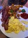 bacon. eggs, home fries and toast plus a serious amount of coffee. food was average but filled the gap. service was good and we got to experience the light/special effects show as we dined.