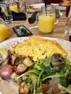 Best omlet I have ever had. Called “tailored omlets” - You can select up to 5 add-one - so i chosed chicken, roasted peppers, kale, spinach and cheddar cheese. It was thick and just so flavorful. The dish came with the perfect amount of roasted potatoes (about 8-10 cubes and a wonderful wild leaf salad with a very very Light oil/vinegar dressing on it. Healthy and filling. Also had a protein shake (vanilla whey) called Queen of the jungle - with kale , spinach, banana,?and OJ. Yum!