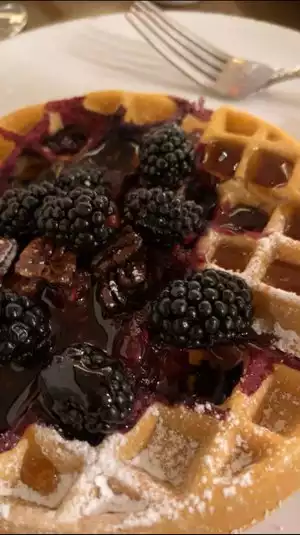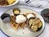 I just had 2 great fried chicken and waffle meals. The breakfast portion was so large (and delicious) I had a second meal of cold fried chicken later that day. We sat outside under an umbrella on a beautiful sunny day. Mom and little children ate waffles, scrambled eggs, bananas and some amazing toast. Great atmosphere, excellent service, appropriately priced. I loved it!