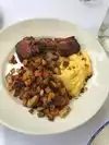 Charming environment with a limited but interesting menu. I had a crab cake as well as cornbread. Husband had trout. Both were good. The crab cake could have had more crab but was tasty. The cornbread was yummy as was the trout. The indoor section of restaurant is very inviting but we sat on the beautiful patio because the weather was perfect. Waitstaff attentive. Tables not too close together so we could relax and enjoy the evening. Not inexpensive.