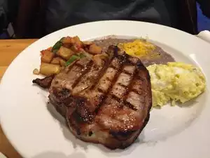 We left a neighboring restaurant when they told us the wait time to be seated was 1.5 hours and stopped here on a Sunday right before noon - not a soul in the place, so we were a bit skeptical, but that was shortly lived! We were surprised that breakfast was available. Our server, Isabella, provided us details on breakfast items available in addition to their menu. Hubby selected pork chop and eggs. The pork chop was huge! Pretty tasty as I stole a bite from him. My huevos rancheros was good. Served with corn tortillas, bacon, refried beans and potatoes. Yummmmm! As we departed, the dining area was just about filled to capacity. Guess we found a secret spot for some damn good breakfast!