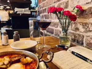 We stumbled across this restaurant whilst wandering in the neighbourhood one night (our hotel was near). It was cold outside and this place looked really cosy. There was a short queue for a table once we got inside but we didn't wait longer than a few minutes to be seated. There is an open wood pizza oven and the heat from that was very welcome. It's a small, cosy venue with a lot of tables in a small space but we didn't feel too overwhelmed by this. I'm not sure I would think the same if I was going for a romantic meal though. The staff were attentive and helpful when asked about the menu. We had a sharing mezze platter to start and our waiter was really good explaining what everything was and what it was made of...and we didn't even ask him! Lovely bread handed out freely too. The portion sizes were just right for us...not too big but we were fully satisfied. We had three courses each with a couple of glasses of wine and it came to about $90 (£60) which we thought was pretty reasonable. Overall, if were back in the neighbourhood again, we would definitely return.