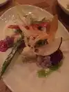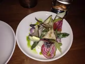 A very small and somewhat noisey dining room but the great service and delicious food soon made us forget all about that We started with the short rib beignets which we thought were delicious with the very rich demo glacé for dipping. The escargot croquettes were a disappointment with hardly any escargot flavor but we ate them all. We added a salad which was more of a crudite with watermelon radishes, cauliflower. Pea pods and a soft egg ....very refreshing after two deep fried appetizers. We shared a 20 oz 60 day aged rib eye which isn't as big as you might think once you remove the bone and fat but certainly enough for us seniors! The younger guys next to us had no problem each devouring a whole steak themselves. The steak was the highlight of the meal, cooked perfectly and delicious. It didn't need the bearnaise sauce that came with it. We ended with baumkuchen for dessert...how often do you see baumkuchen on the menu? We enjoyed it with a cup of tea and left very contented. The menu had a great variety of items that I'd like to come back to try. Once again the waitstaff was extremely professional and efficient