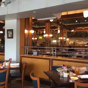 Food is really good here. We go late for dinner so we can get a booth, but the rest of the seating indoors looks uncomfortable. Outdoors is nice for lunch on a pretty day -- they have a secluded garden patio and will turn down the music there so you can visit if you ask. Service is good and quite friendly. Awesome burgers and sandwiches. Full bar.