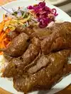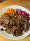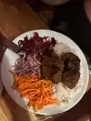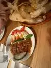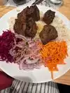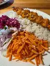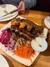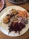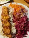 We ordered the chicken sis kebab with rice. We substituted the red cabbage, pickled beets and carrots for a garden salad with carrots. However, most of it came with a lot of onions. Regardless, the dinner portion was very good with rice and 6 pieces of cubed boneless chicken breast. We also ordered 2 dips, the cucumber yogurt and humus in order to dip our chicken. It does not come with any pita or bread. We found that the dips are little overpriced. Food was delicious! The atmosphere is very nice and of Turkish/Mediterranean design. Service was good.