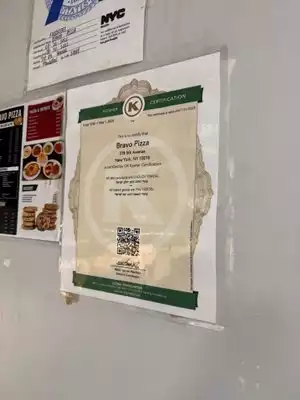 Bravo Kosher Pizza has a great menu with classic NYC slices , calzones and many pizza options. The pizza oven gives a slight char and great classic taste. The dining area upstairs is a nice break from the city hustle. Great pizza and great atmosphere.