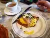 Parked on the street just around the corner, cutest neighborhood, forgot to ask if they had parking but was not an issue (just look at signs). Easy to find, indoor and outdoor seating, pleasant music, sunny faces to greet us and prompt waiter with a to-die-for smile (wish I had his beautiful teeth). Moving on, started with tea (they offer "Thes" I love) a variety to choose from for $3.50; Chamomille, Turmeric Ginger, Jade Cloud, Magrab Mint or English Breakfast. It comes individually bagged (they bag it themselves). I did traditional English Breakfast with milk and honey. Extra hot water was prompt. My husband got the coffee drip for $2.50, fresh cup when he needed it. For brunch I opted for the Avocado and Radish ($10) poached egg, on toast, the avocado is "mushed" up with lime and chile. Delicious, I should have asked for steak knife, the crust was a bit touch on the sour dough toast but so good! On the side was a small green salad with a few slices of radish and a perfect champagne dressing. My husband started with one of the Farmers Cheese for $7.00 (today's was from Vermont - like butter) and comes with two slices of toast, apricot preserves and granola. YUM! He then had the omelet of the day, which was a nice french herbs and a side green salad. I believe that was $10 (might have been $11). Was worth it. When we were done and all paid for, again prompt service, we walked in to use the restroom and saw the wonderful looking pastries! Glad I did not see those first or I never would have eaten my food! YES please ALL OF THOSE! Go, Enjoy! Relax and Feel Pampered! Oh and by the way, American, English and Frenchmen! YES!