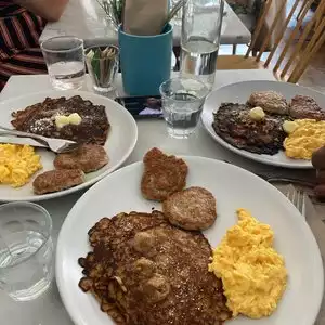 We were told of this place by our waitress at another restaurant the night before. We waited 10-15 minutes before we went in, by time we left the line was an hour plus long, and it was cold and raining outside. I don’t know if I would wait that long in the rain, but the pancakes, soft eggs, and sausage were worth our wait. For reference we arrived around 9:30am on a Sunday morning in February.