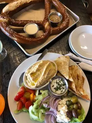 One of my Favorite places in town. Great beer but not just beer they have great food. A buddy and I stopped for the big Nacho plate thinking no problem eating nachos. We tried our best but could not finish the big one. Two people can easily get stuffed on the small one. The hummus plate is one of our alternatives, the wife likes all the veggies, cheese and olives, and great for two. Outdoor picnic tables you share, roll up garage doors when its nice. Gets crowded on the weekends. Friendly place.