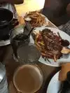 The upstairs was closed off, and the bottom floor was almost completely full. Only 1 waitress!! It was a bit of a late lunch time, but not that late... Not such a great idea, but the waitress truly was not giving us adequate or even mediocre service. The decor and atmosphere of this restaurant is pretty awesome. Food really was delicious! I got the croque monsieur, with an organic egg, served over frites with bourbon dragon sauce and my husband got the Stoofvlees (traditional Belgian stew) served over frites, with cheese curds. Holy...yum. Both were very tasty. My husband's meal could have had more cheese curds, but not a big deal. Would recommend, just would suggest going during peek hours so they are (hopefully) staffed better...