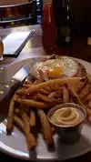 We went in here for a very late lunch on a Sunday afternoon and discovered that a Happy Hour (3 to 6 p.m.) had already started. So I ordered the shepherd's pie off that menu and my husband chose a lamb burger with fries from the standard offerings. The massive portion of pie arrived with a leathery melted cheese covering, which I scraped off. The interior mixture proved to be good. The lamb was a bit too spicy for our tastes and many fries in the huge pile that arrived were burnt. This cafe's focus seems to be on drinks with a long listing of beers, ciders and hard liquor. A bar takes up almost one full wall in the large room, which has myriad tables and chairs and a few booths. The upstairs dining space is open to the main room below, and a patio offers additional seating. During our stay, most of the customers sat on the patio, but we chose a booth. Our pleasant waiter was prompt and attentive. This ultra-casual eatery appears to appeal to a young clientele and would likely be a good choice for groups out for a night on the town as long as no one is interested in fine dining. Street parking is available in the immediate neighborhood.
