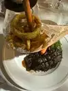 The espresso Martine (esma) is not on the menu but is a classic so they can make. For my taste too much vodka not enough coffee liqueur. The red wine as so often too hot, with hot weather it is often not room temperature. This fruity cheap wine is better served a little cooler. The soup was delicious. The service extremely friendly and the location great with good weather. In winter with the skating rink on the doorstep too. The filet mignon burger was totally good. Good medium baked but also not special. Another big bowl of fries. Had a lovely evening with great food but the drinks could be better for $20 dollars on average.