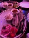 Dark and cozy atmosphere, colorful lights and live music. We walked in on a Sunday afternoon from a chilly walk outside to a warm, lively, friendly setting inside. Service was great from Kylie M (5 stars). The heavens parted and delivered cinnamon rolls for an anytime of day appetizer! My husband, son and I split a 3-meat sampler: pork, brisket and burnt ends. We preferred the two beef options. We had cornbread, texas toast, pimento cheese spread on the tray and for our two sides we chose mac-n-cheese and the sweet potato fluff. Both were memorably delicious. Only "downside" was the music was very loud. We enjoyed the musician and appreciated the tv options for sports.
