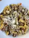 Excellent light dinner of a tricolor salad and wild boar ragu pasta. Sitting outside on a cool evening with such superb food was a delight!