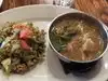 Lunch special of half of a Tea Leaf Salad and the Samusa soup was fantastic...not like another salad ever ...and just amazing....Ordered the pork curry suggested by the waitress and without cilantro. Received chicken cut up in little bony pieces with loads of cilantro...we ate it not knowing it wasn't pork until someone came and apologized....the mint salad had loads of cilantro and the chicken was in kind of fatty. bits...the sauce was great, the rice we ordered we didn't get either. The coconut fritters with fruit and coconut ice cream were crunchy, not greasy and delicious...highly recommend those too. Would return in a heartbeat, but would double check the entree and go vegetarian to avoid the odd chunks of meat.