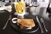 Our first night staying at Parc 55, we wanted a quick meal, so went down and ordered burgers and fries to take to the room. Excellent Angus burger with great bacon and an excellent white cheddar. Shoestring fries were just perfect. Later in our stay, we went down for happy hour and had the house red and the house made chips and dip. Loved the Point Reyes blue cheese, the mayo with horseradish and the smoky BBQ sauce. We decided to stay for dinner and really enjoyed both the steamed mussels (large portion, could to finish) and the mushroom flat bread. Our waiter was excellent and attentive. Definitely a great place to eat!