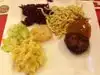 Had three kinds of sausage, fricadels, snitzels, sour crout, cucumber salad, potato salad, straw like pasta, baked chicken, and three sauces and red cabbage. For desert fruit blended in cups and dried up pastries. For the money $25. The buffet could have been better.