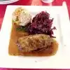 Went here again with my wife a couple weekends ago. We had the rouladen for dinner. The entree is big enough to split between two people. You get the rouladen , red cabbage and dumplings. The dinner portion is two rouladens , lots of cabbage and two dumplings. Everything is made fresh daily and it was excellent. My wife's mother is German and my wife said it tasted just like she used to make. We also had a fresh salad, a freshly made pretzel and we split a cherry strudel for dessert. The restaurant is totally authentic in its cuisine. You definitely need to give it a try.