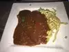 Can I just say I love schnitzel? I had already made up my mind to try this place. It is in a strip mall and nice and quiet away from the strip. Real home cooking! Not pre-fab stuff you find elsewhere. So impressed with the owner and food! I had jaeger schnitzel of course, potato salad and sweet and sour cabbage. Hubby had a burger with a mix of beef and sausage. He loved it! Mine was exactly what I wanted! Delicious! The German potato salad was not what I was accustomed to, but very delicious all the same. It was cold and had some yummy dill and cucumbers. I would go back here in a heartbeat!