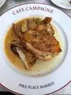 Cafe Campagne is conveniently located just a few steps from Pike Place Market. There is a fine assortment of beverages as well as food entrees. The escargot were good but needed a bit more garlic for my taste. The onion soup was one of the best ever tasted. The Duck Leg and Cassoulet could not have been better. The Chef very kindly prepared 4 apple tarts for us to take home to our family.