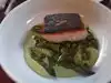 The weather cooperated and we were seated at a quiet outdoor table . The salmon special was delicious as was the French onion soup . Service was friendly and efficient. Extensive wine list. We skipped dessert but were tempted by the dessert menu.