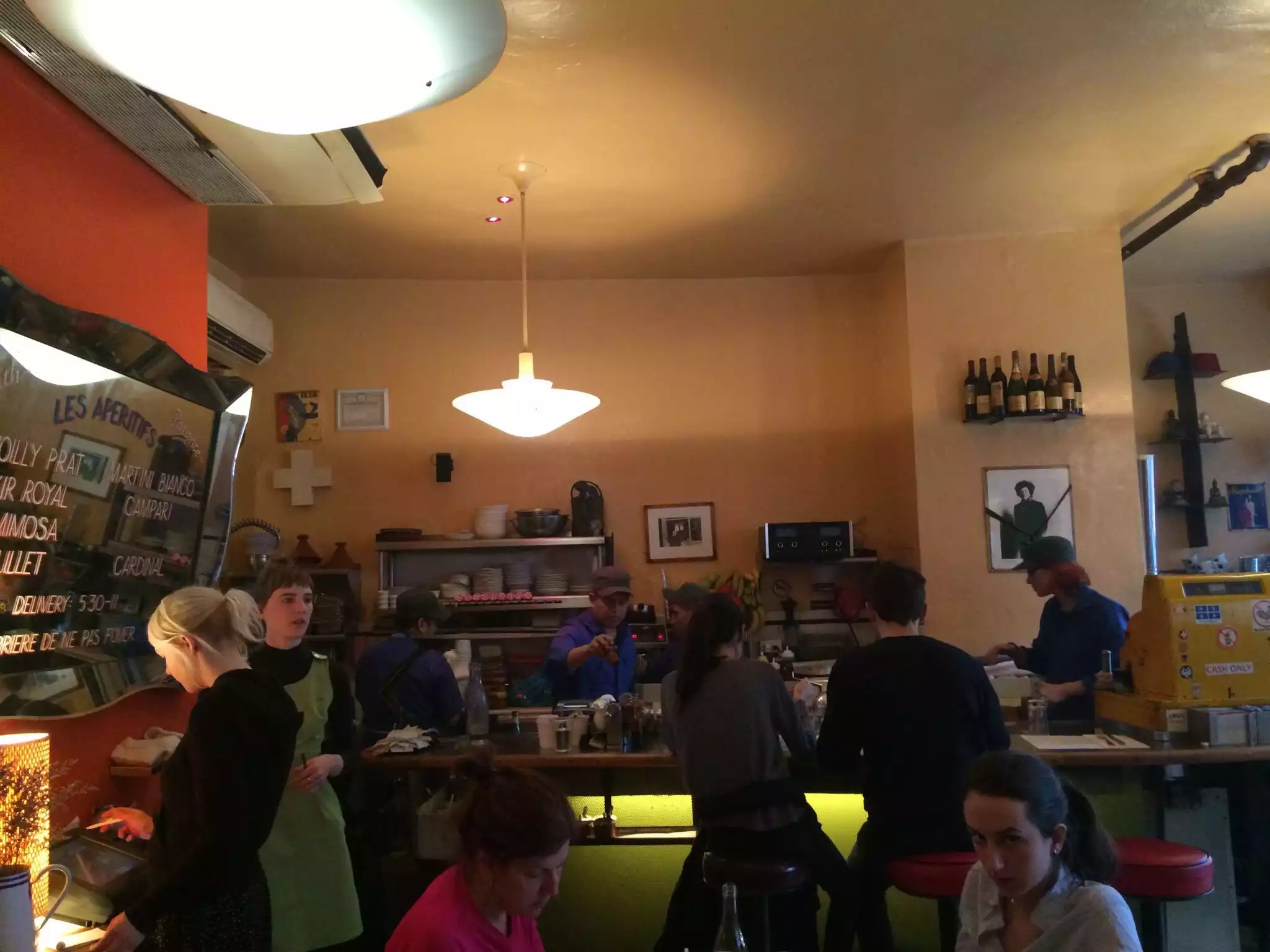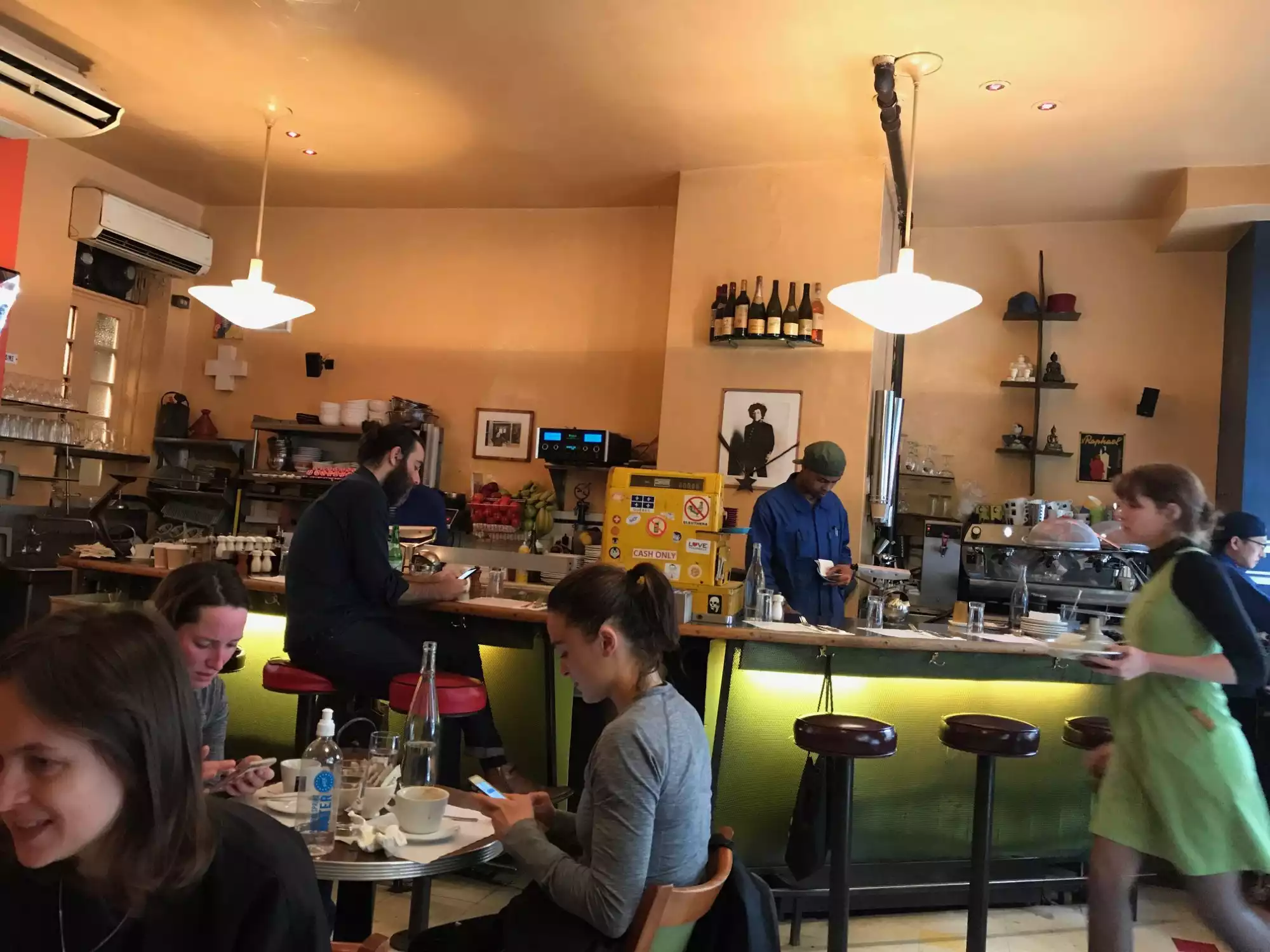 Petite Soho brunch/coffee venue for trendy New Yorkers in the know. Bowie lived around the corner. French magazines hang on wall racks with photos of Jean Morreau. Large mirror on the back wall reflects Villagers coming and going. Healthy breakfasts include avocado toast with fried egg on top (Madame!) so tasty you'll order another. Decent coffee too - mais bien sur!