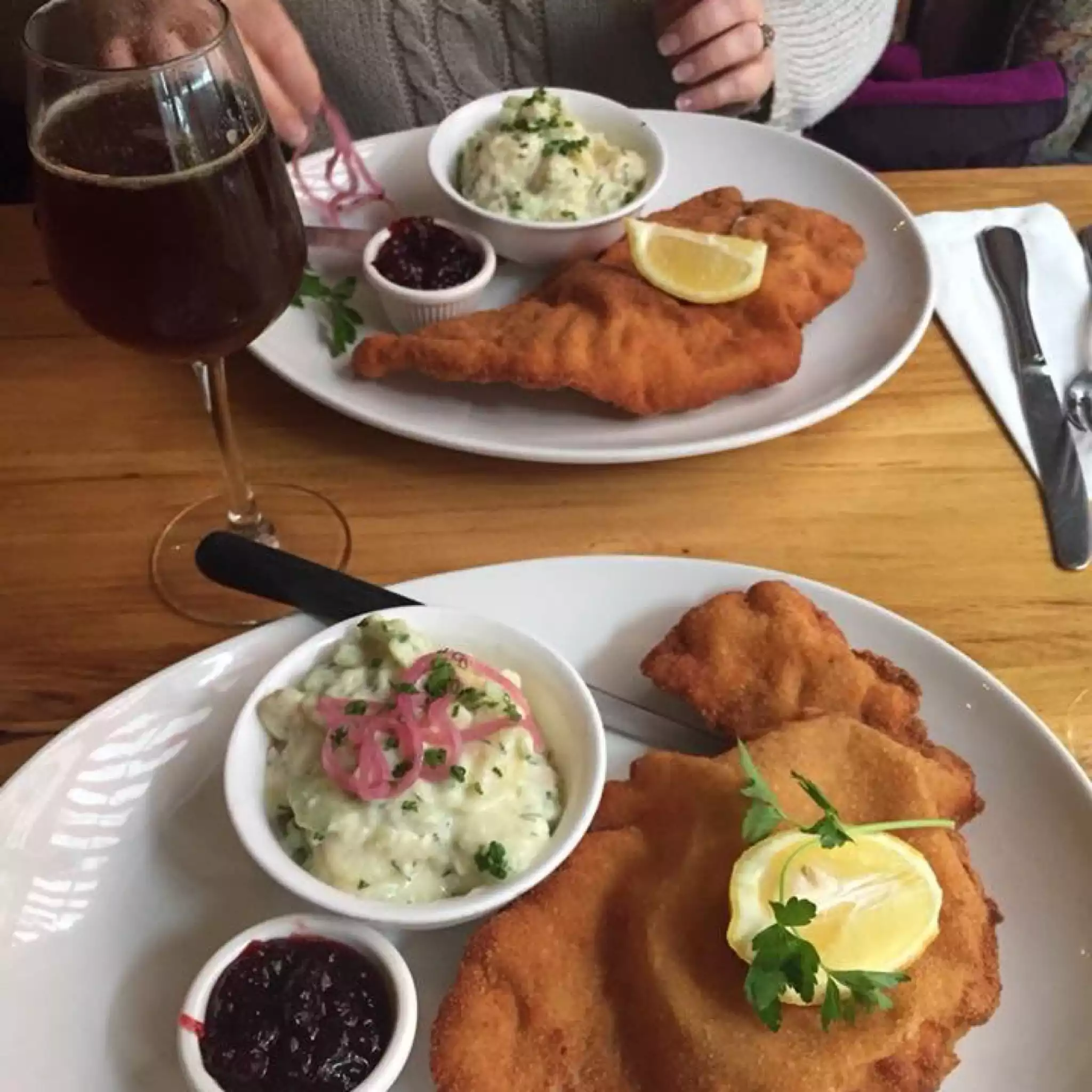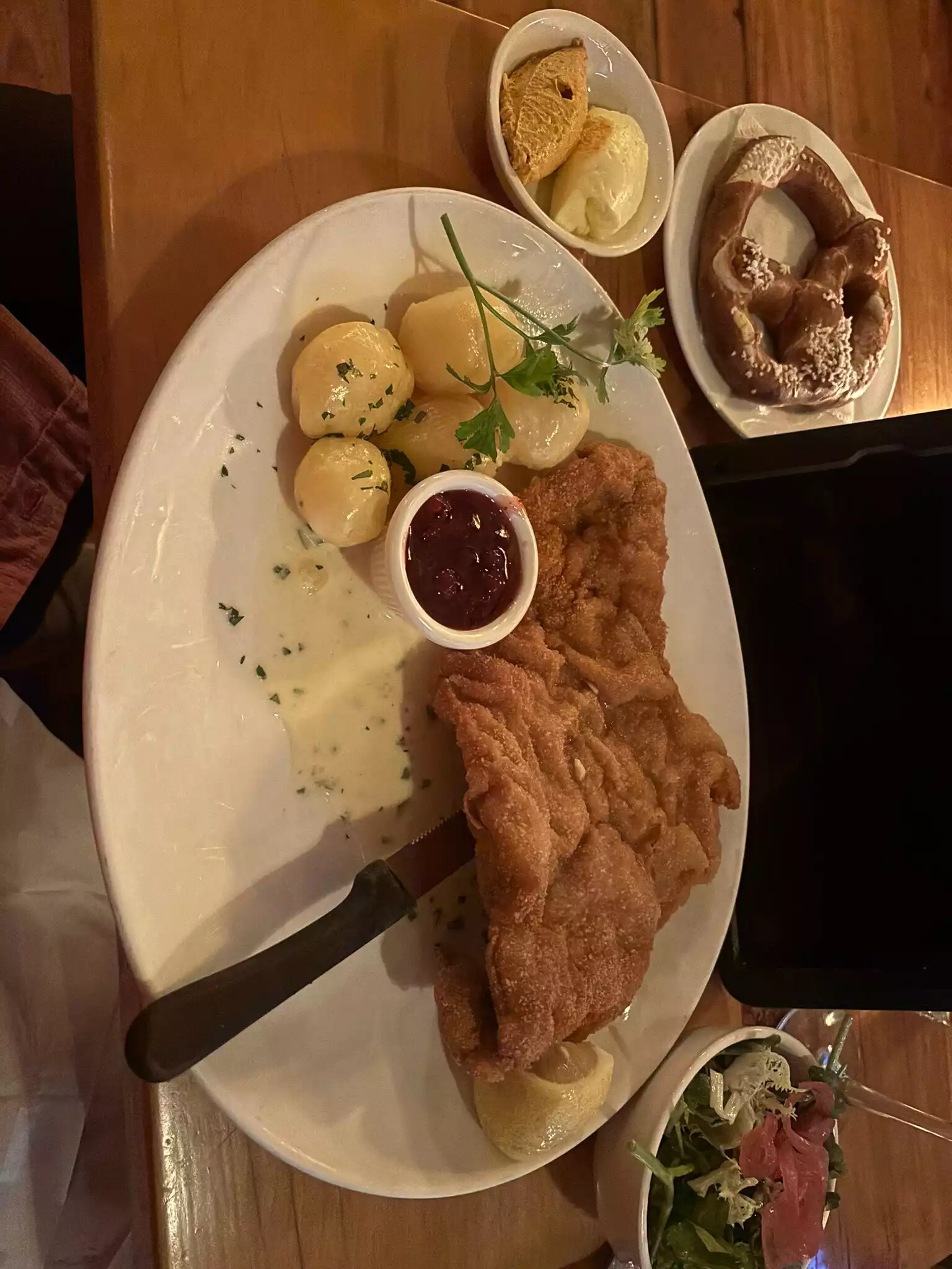 The waitress who serve me could’ve been more welcoming Even a bit of a smile would’ve been nice for being greeted by somewhat surly waitress did not help my mood. The major appointment would come with the food. I was really looking forward to having some schnitzel since my mother was from Slovakia and my father from Austria and I’ve had great schnitzel both in my native Australia, as well as Austria and Slovakia and it’s very hard if not impossible to find a restaurant that serves this in Los Angeles. Suffice to say I was incredibly disappointed. The veal assuming it was veal was very tough and overly thick schnitzel is supposed to be thinly pounded. It was also very, very salty. The best part of it was the potatoes and the lingonberries.
