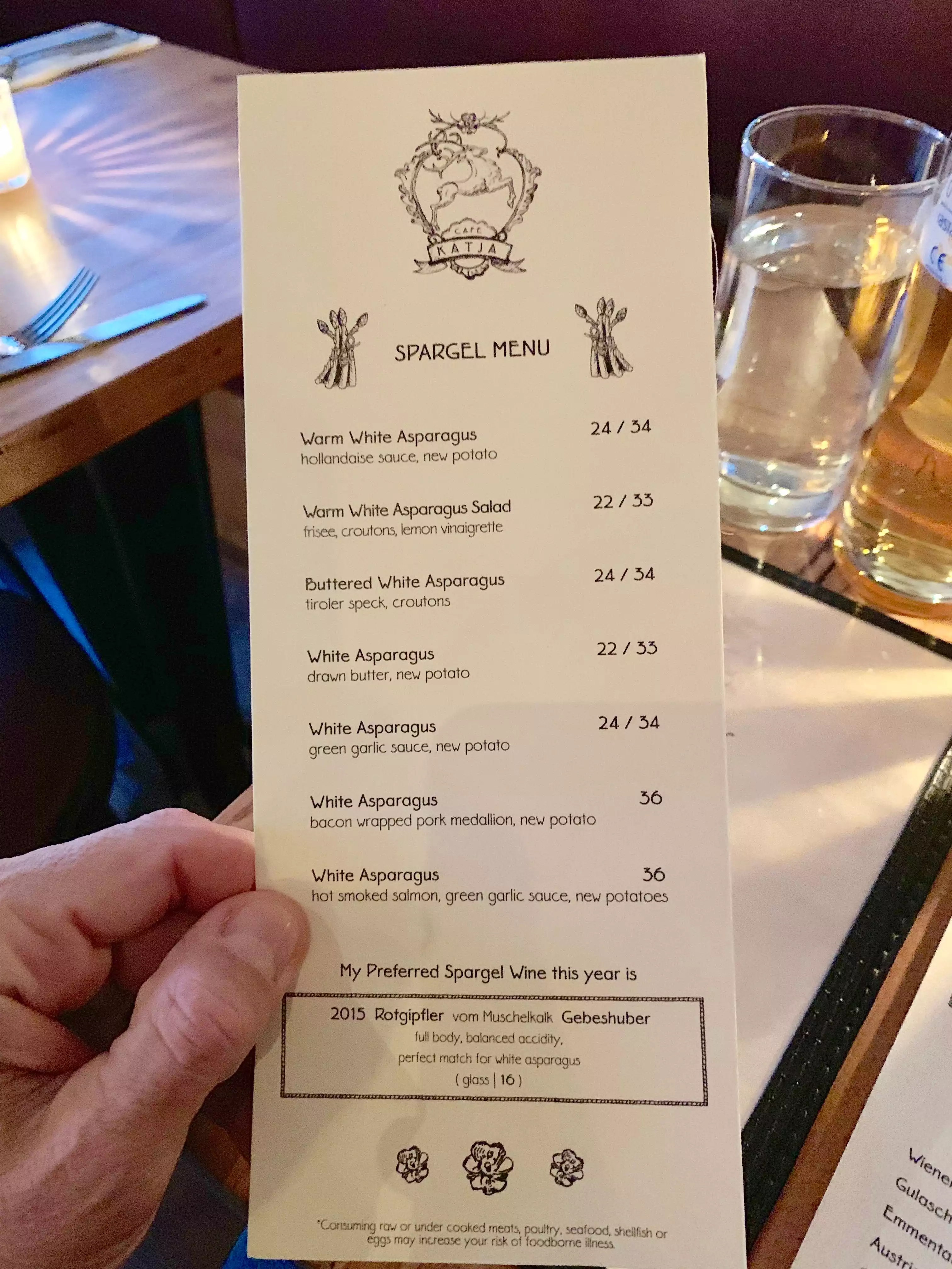Nice asparagus menu,the best thing about spring time. A party of four had all different dishes and we're all happy! Nice German beer or wine to go with it.