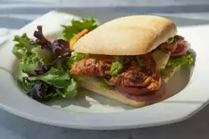 Stopped in today and had lunch. Had a spinach salad wrap with grilled chicken. It was wonderful very flavorful on a spinach wrap with mushrooms onions tomatoes in a balsamic dressing, My boyfriend had the California chicken sandwich on ciabatta bread with a side salad. With a beer and a diet coke lunch was $28. Big servings, intimate atmosphere in a small setting . You can even at a table in the front window! Would definitely eat here again. They appear to offer numerous coffee latte beverages with a large clientele.